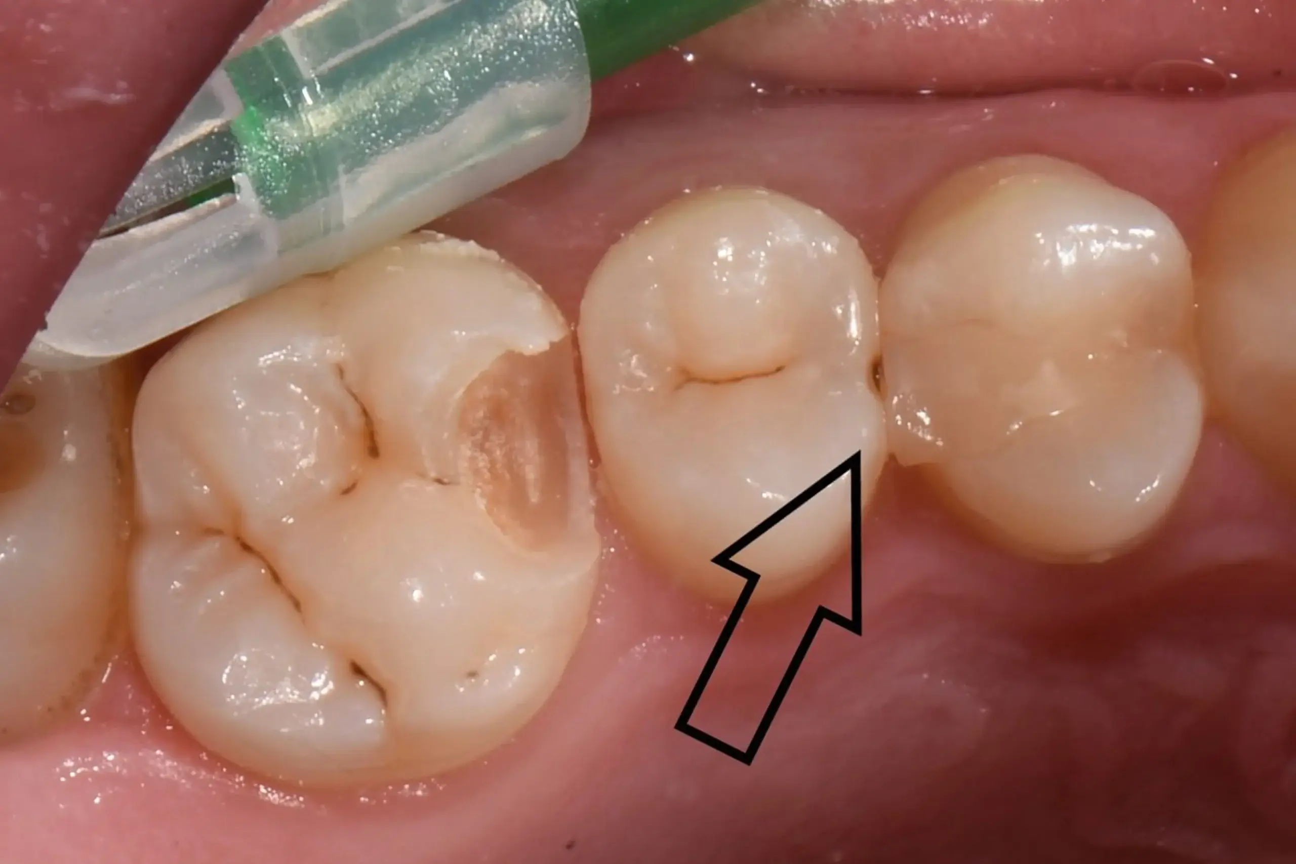 - Schutzbarriere: Wir decken die gefährdeten Bereiche direkt ab, bevor die eigentliche Composite-Füllung geschichtet wird.